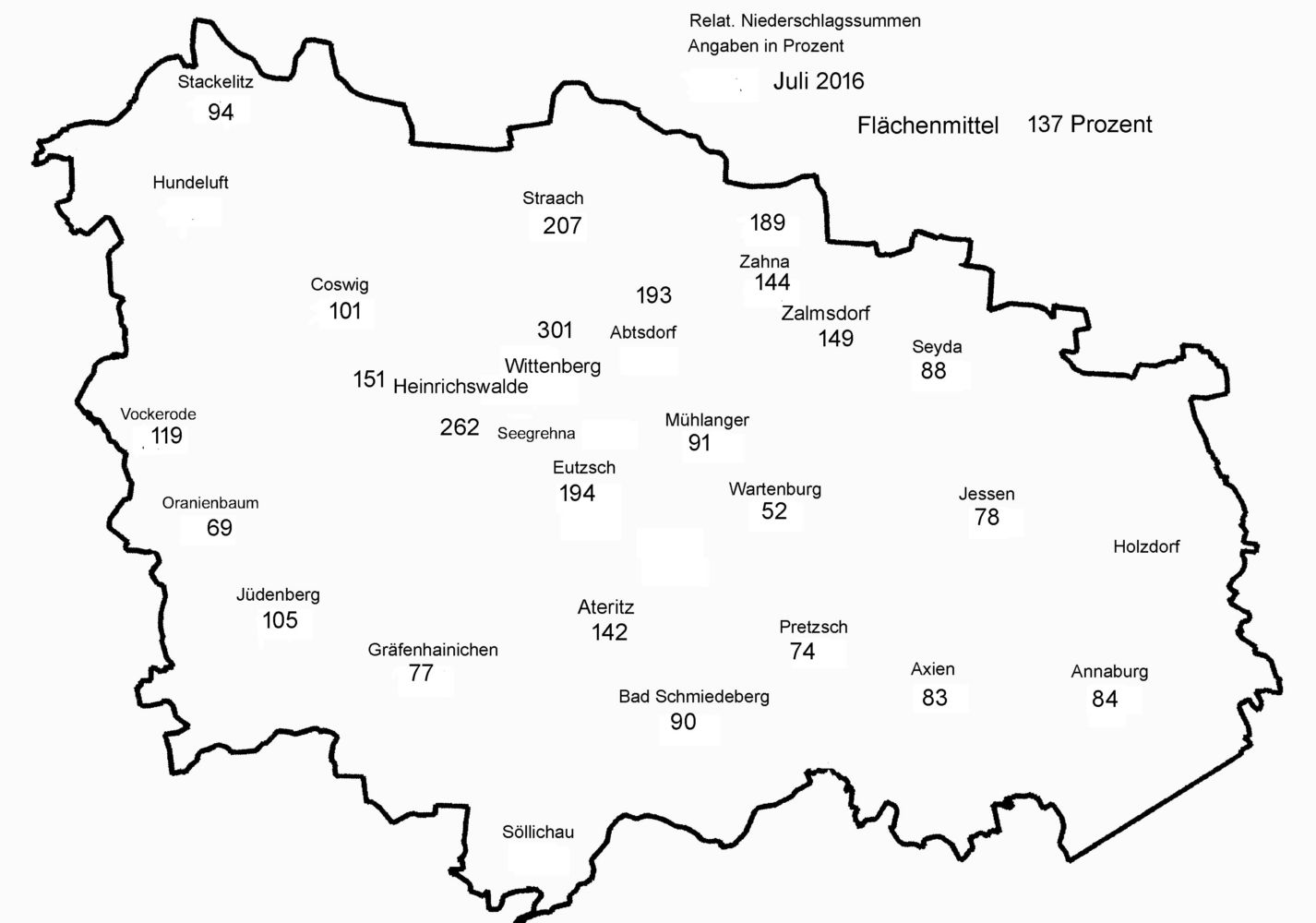 Relative Niederschlagshöhen 2016 im Landkreis  Wittenberg